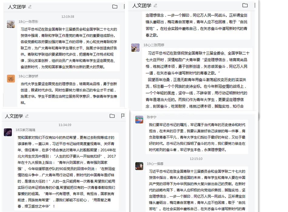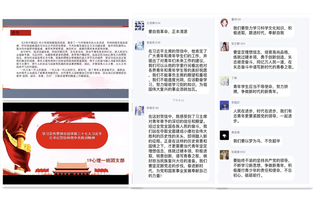坚定跟党走,奋进新时代。人文与国际教育交流学院分团委各团支部通过线上线下相结合的方式深入学习习近平总书记的寄语,从总书记对青年一代突出贡献的肯定与赞扬,再到党中央致词中对年轻人的殷切期望,都深刻突出党对年轻人的关怀和厚望,引发了每个学生的情感共鸣。同学们在班会中畅谈着自己的爱国情怀,基于实际地树立抱负和理想。一场思想的洗礼,将会引领新一代青年人积极投入于社会主义事业之中。