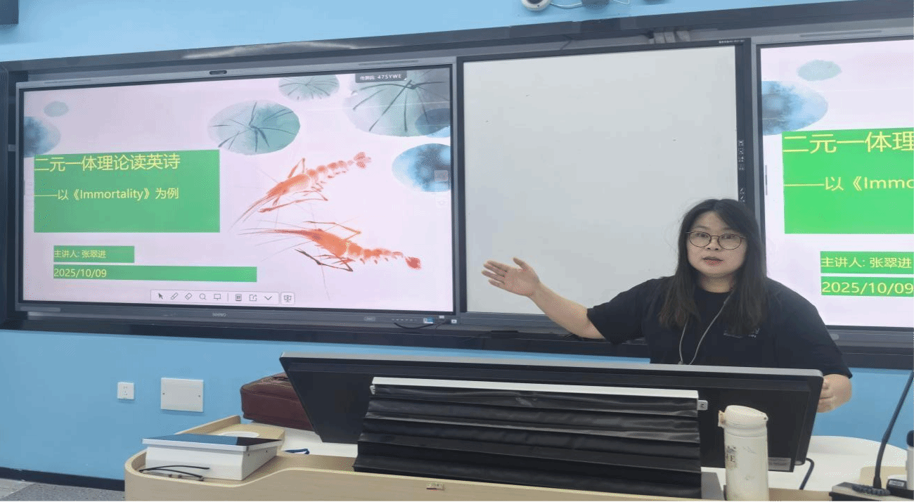 张老师探讨了中国哲学思想中的二元一体理论及其在文学作品欣赏中的体现和应用。她首先阐述了何为二元一体理论,并诠释了经典英诗 “Immorality”。“二元一体”是一个复合概念,常用于描述一种看似矛盾或对立的双重性(二元)如何最终融合成一个和谐、统一的整体(一体),如:阴与阳、黑暗与光明、女性与男性、被动与主动、生与死、动与静等。它强调的是对立面之间的统一与协调,而非冲突。她还从三个维度对选篇展开了深入细致地分析。(张翠进/文图 叶兰兰/审核)